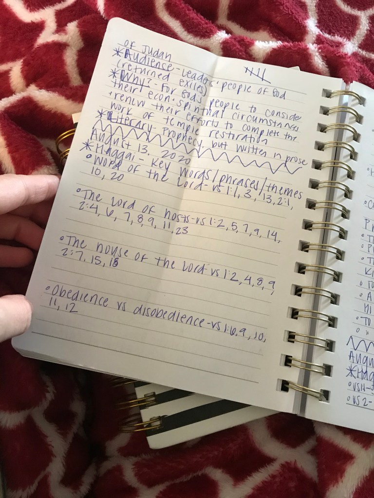Day 2: Read the entire book, making note of themes/keywords. These are concepts and/or phrases that appear often throughout the course of the book. In Haggai, I noticed God referred to as “ the Lord of hosts” a lot. I also noticed the theme of “working for the glory of God,” and others. After jotting these down, I read Haggai again, noting the specific verses that addressed each theme/keyword.