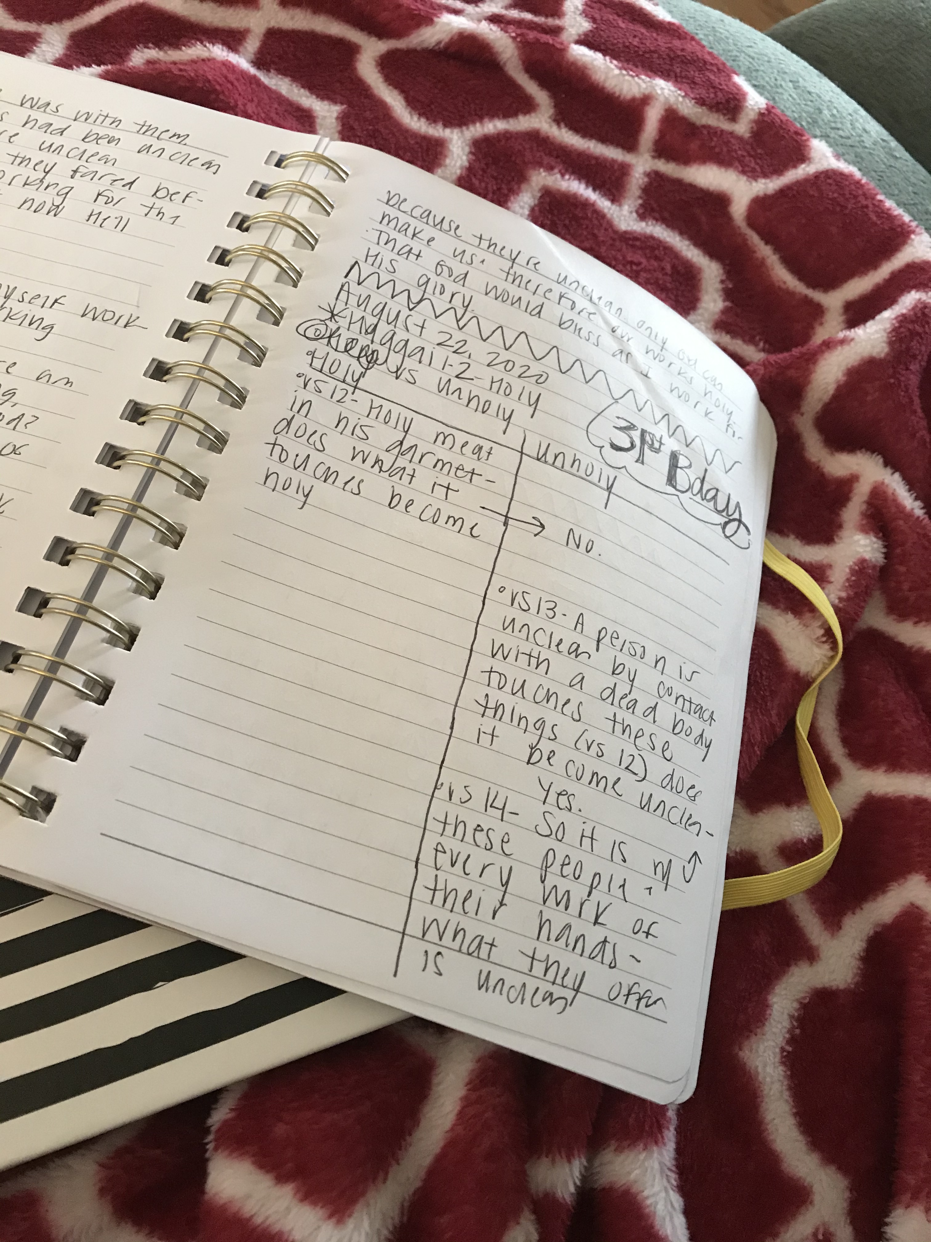 Days 3-10: Next, I spent one day with each theme. I read the whole book, making note of when that theme/keyword appeared, what was said, and what happened. This allowed me to slow down and focus. It helped me meditate on, “Why is God referred to as ‘The Lord of hosts’ so many times?” instead of, “What’s for dinner tonight?” This also gave much needed time to wrestle with the parts I didn’t quite understand. For example, I noticed a theme of “holy vs. unholy,” but those verses didn’t quite make sense (Hag. 2:10-19). For this, I created a “holy vs. unholy” chart, listing what was said about each. This visual organized my thoughts, which was a huge help in grasping the meaning of the text. Other days, I journaled to process what I learned.
